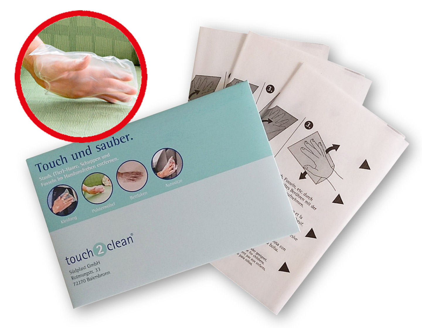 Der touch2clean-Fusselhandschuh nimmt Tierhaare und Fusseln mit seiner Haftschicht zuverlässig auf. Handschug überziehen, Schutzpapier abziehen, die Schmutzpartikel mit der Haftschicht aufnehmen.